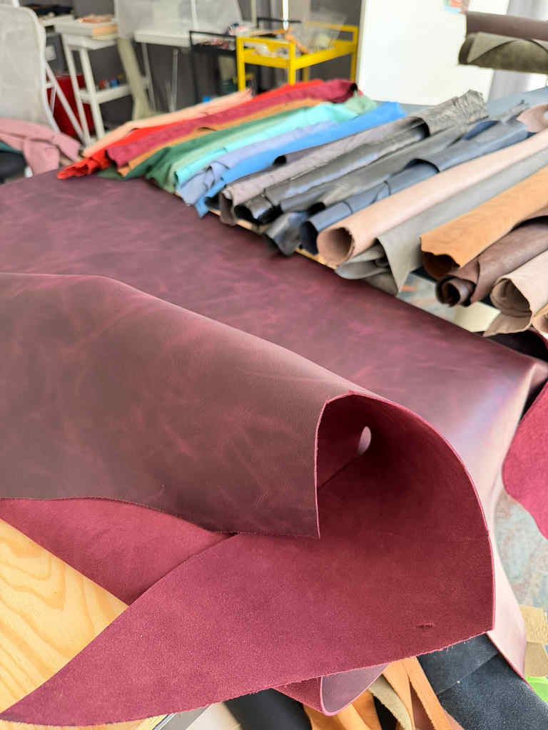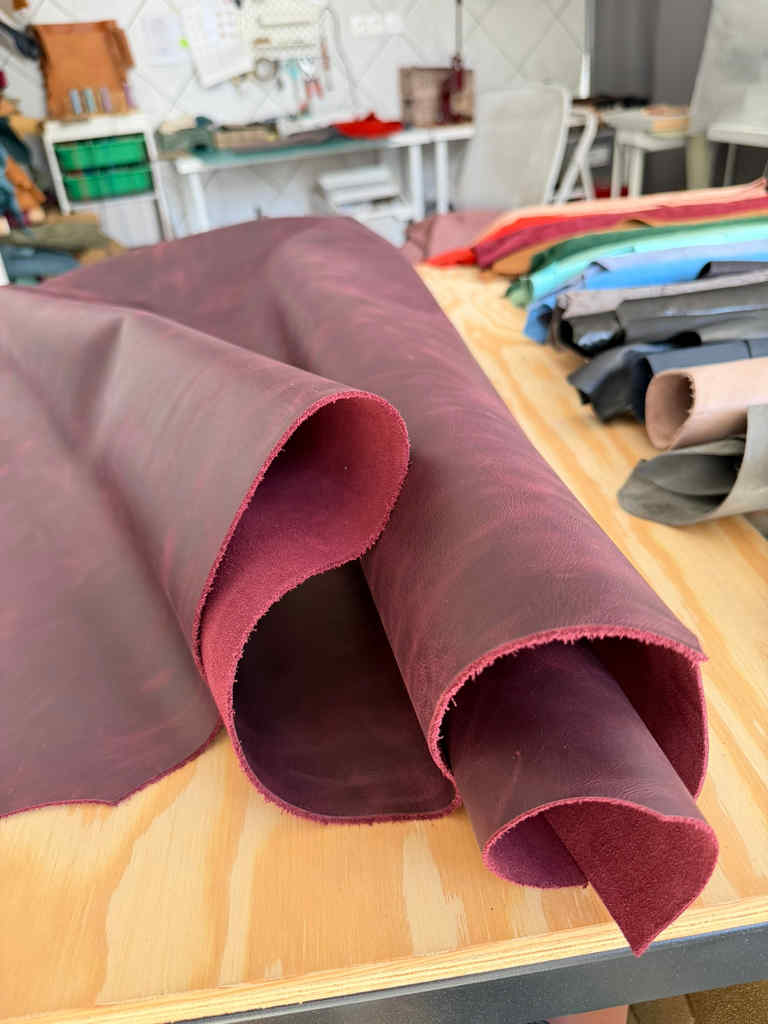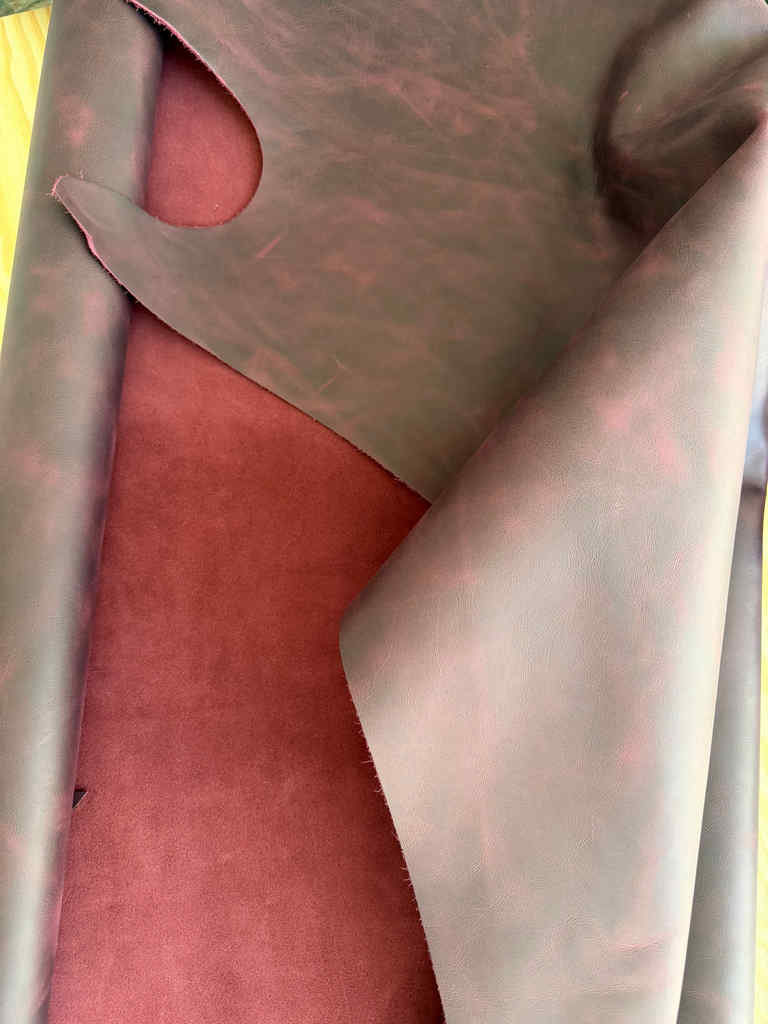 Cherry red pull-up leather is a gorgeous deep red leather with lots of character. It shows natural markings, and the pull-up process means the color will shift and vary as the leather is used and bent in different directions, highlighting its movement and texture.