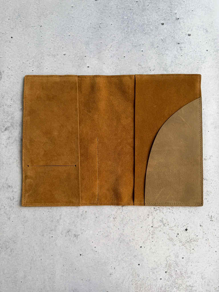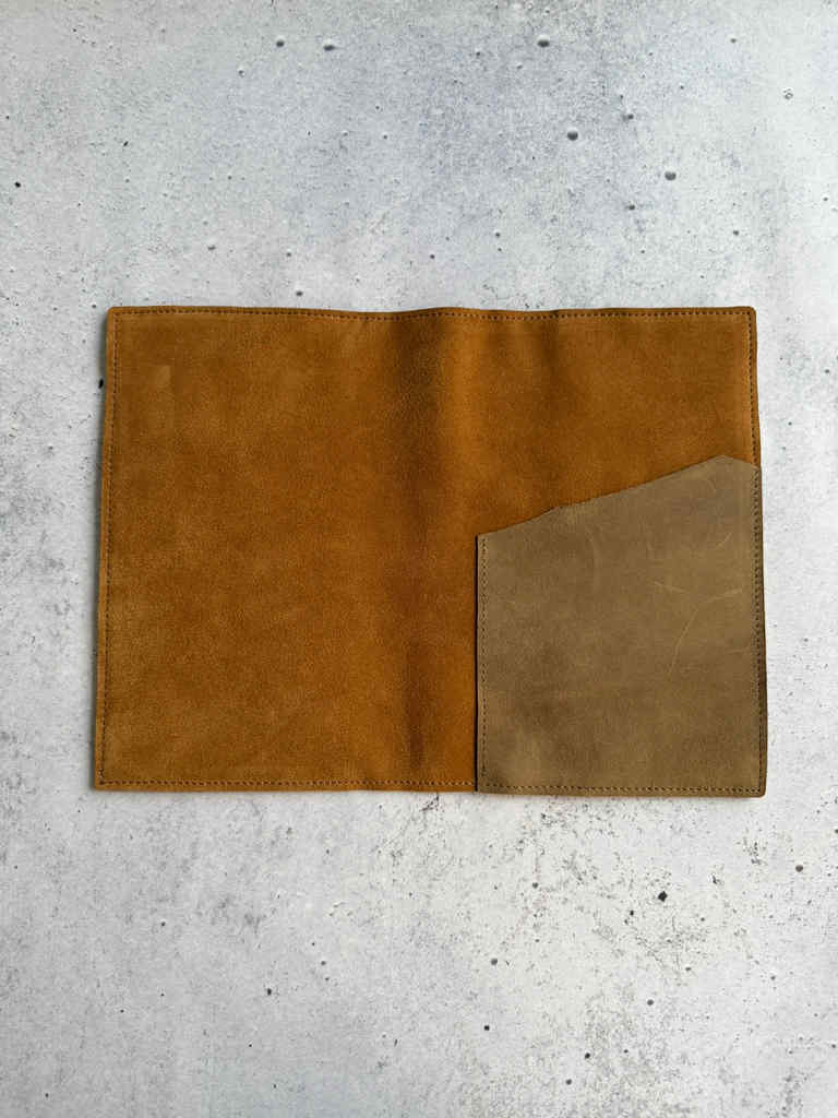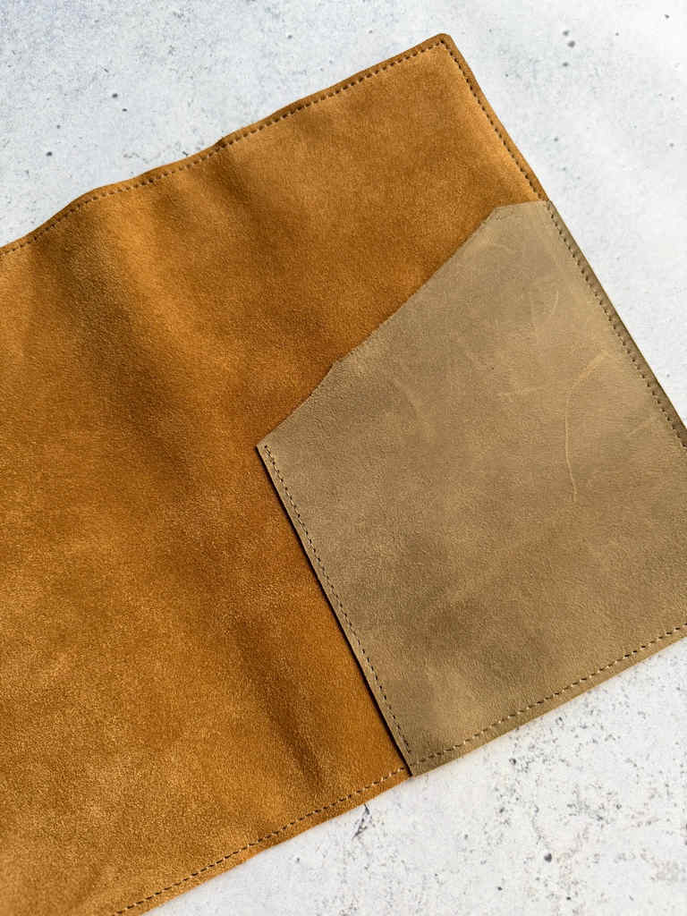 Cinnamon velour is soft and floppy velour leather. This leather will act like a second skin on the notebook. This cover is made with my older pocket leather, so-called dark brown. It has bit more structure so it’s an interesting pairing with floppy velour leather.
