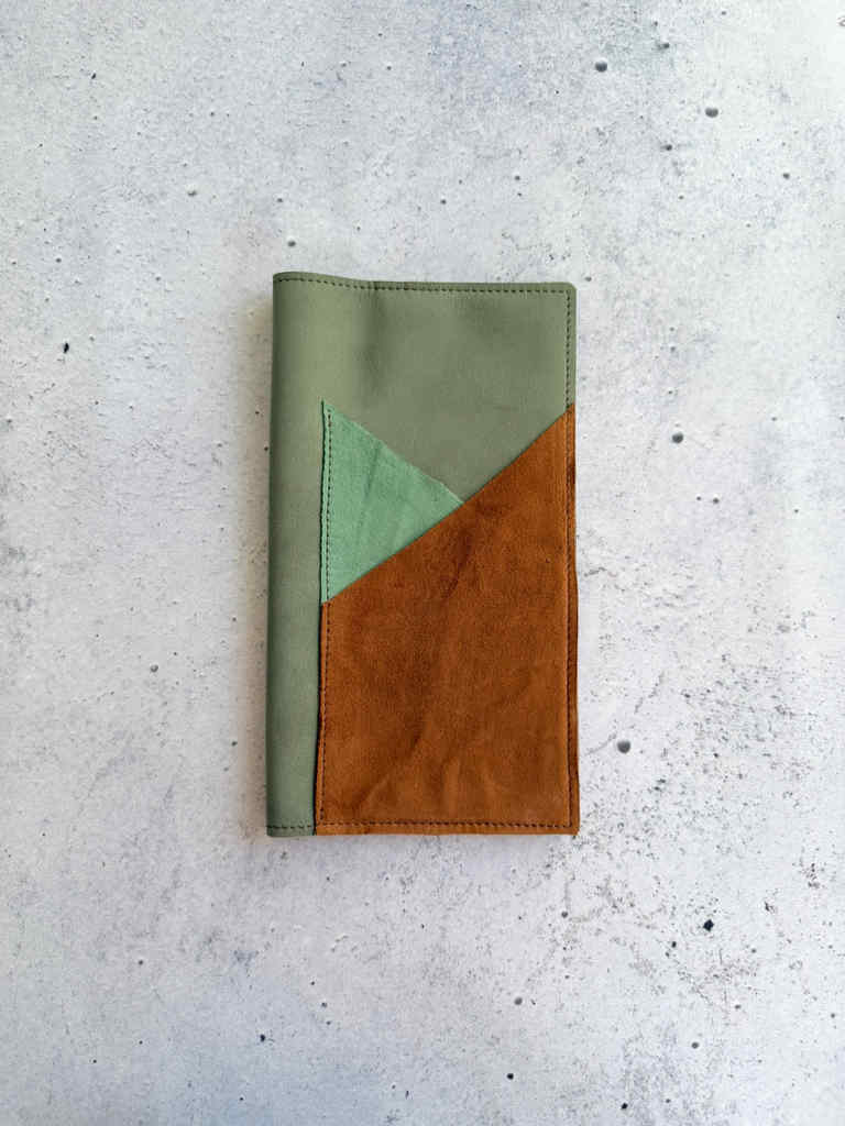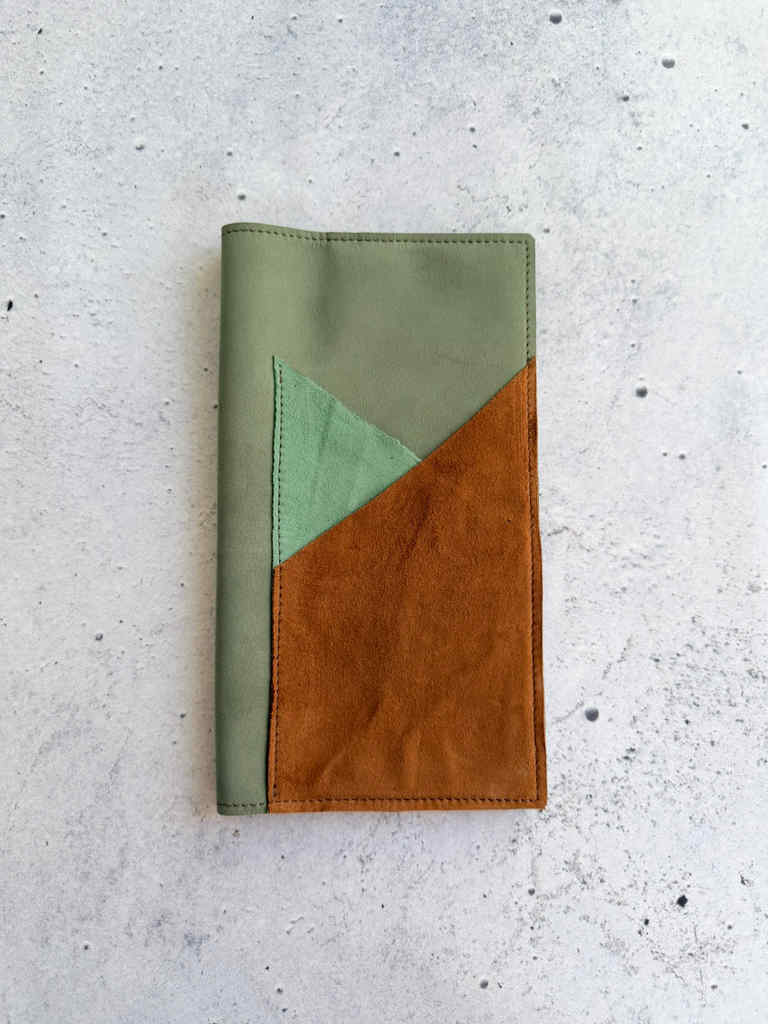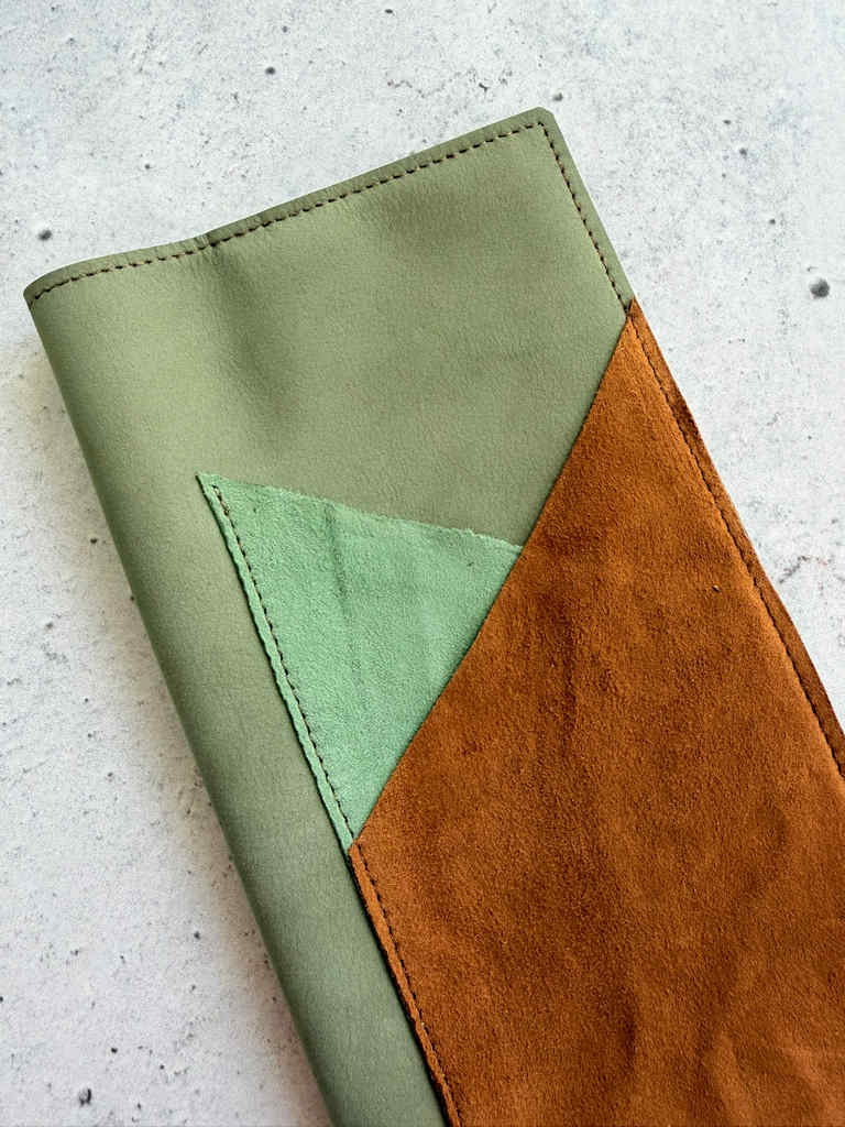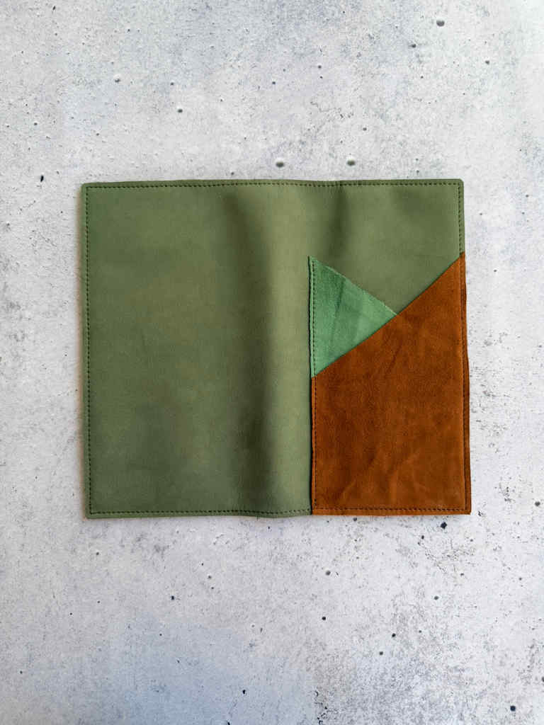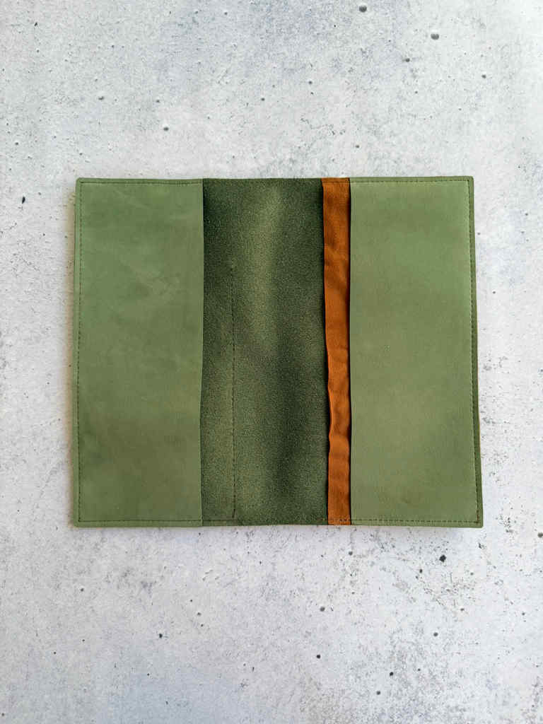Light green olive nubuck leather, softer and floppier nubuck version. This leather hugs notebooks perfectly, it has that amazing nubuck feeling, but doesn’t add much bulk or heaviness to the notebook. This beautiful green leather is paired with Eucalyptus suede and Gold suede pockets for a double outside pocket design. Same gold suede leather is used for double pocket on the inside.
