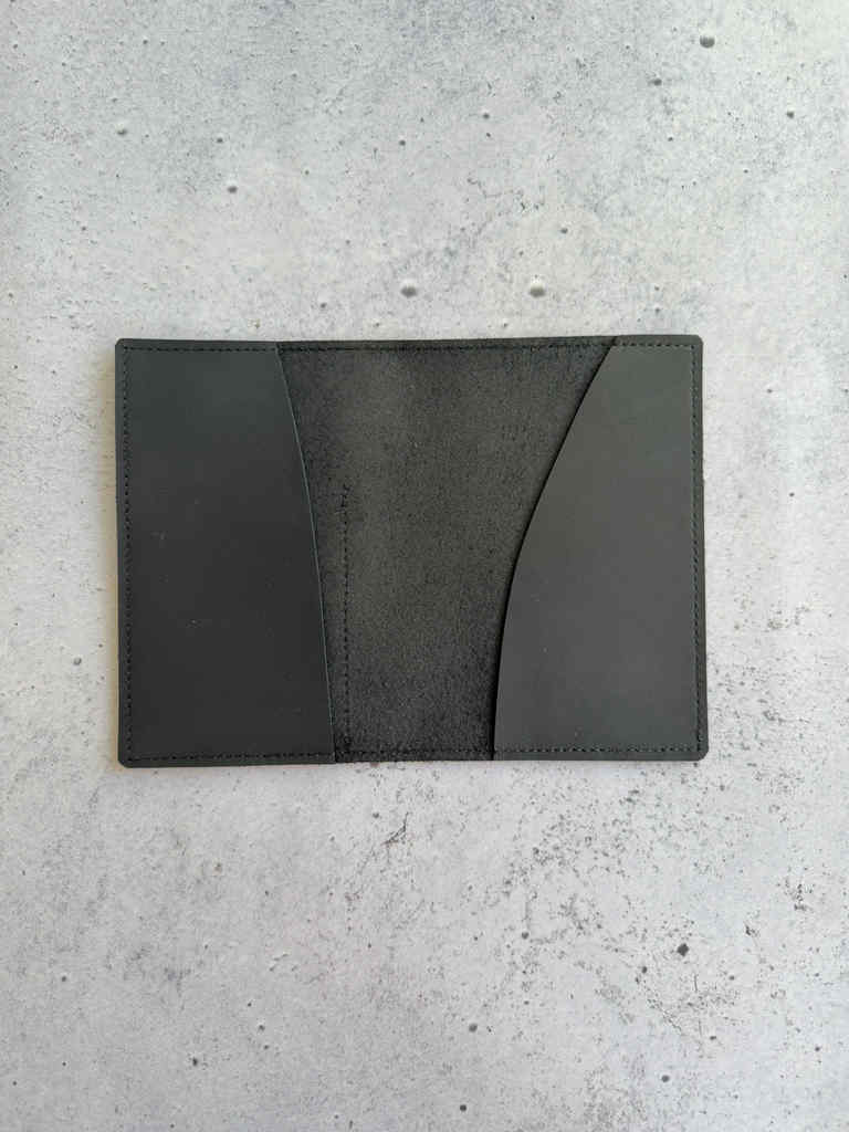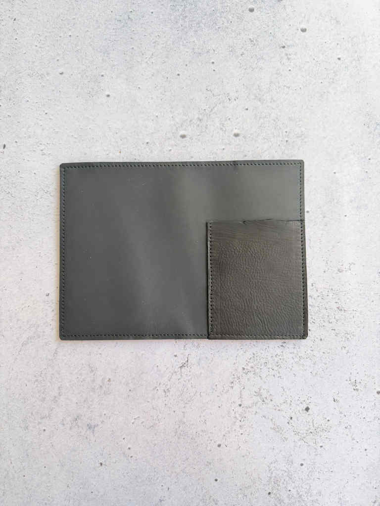 Matte black leather is structured black leather, on the thicker side but still hugs notebooks beautifully. It gets softer with time and use. This leather is also waterproof. This cover is made with Buttery black pocket leather on the outside.