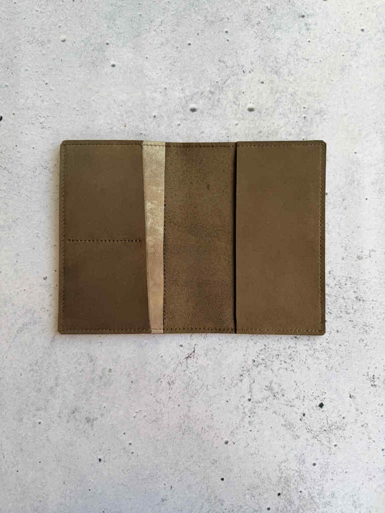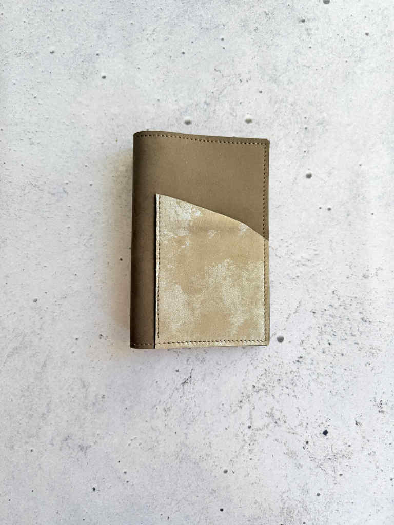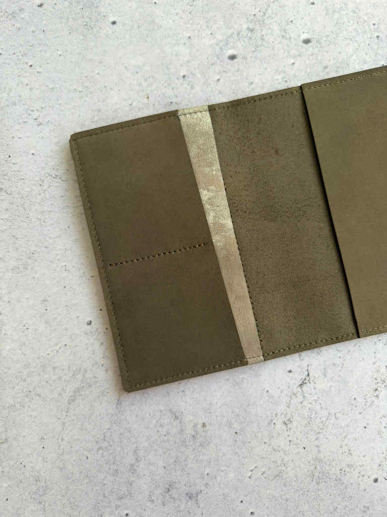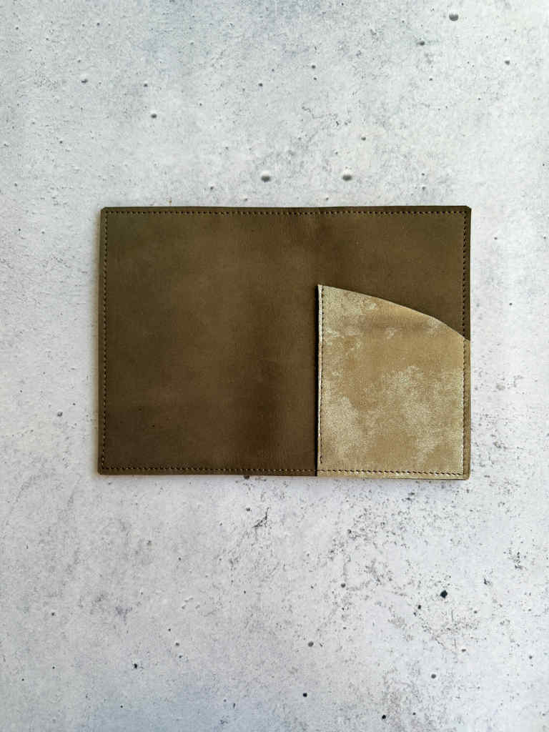 Mushroom nubuck leather is structured waterproof nubuck leather, on the thicker side but still hugs notebooks beautifully. It gets softer with time and use. It has that amazing brown green shade, earthy tones. This cover is made with platinum leather for outside pocket and same leather is used for credit card pockets on the inside.