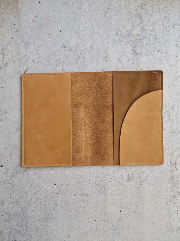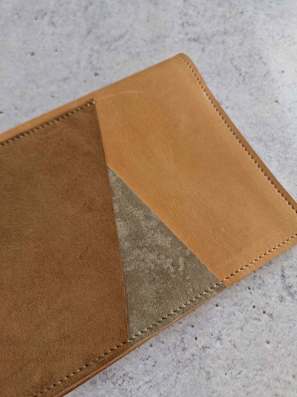 This is bit thicker structured natural leather. It has lots of natural markings and a sewing machine even leaves a bit of imprint on it. It will scratch with time and use, and it will patina as well, but I haven’t test it for longer time to be sure how much. This design has double outside pocket made with platinum and cognac. It also has double pocket on the inside right side made with main leather as secretarial and full length with cognac pocket leather.