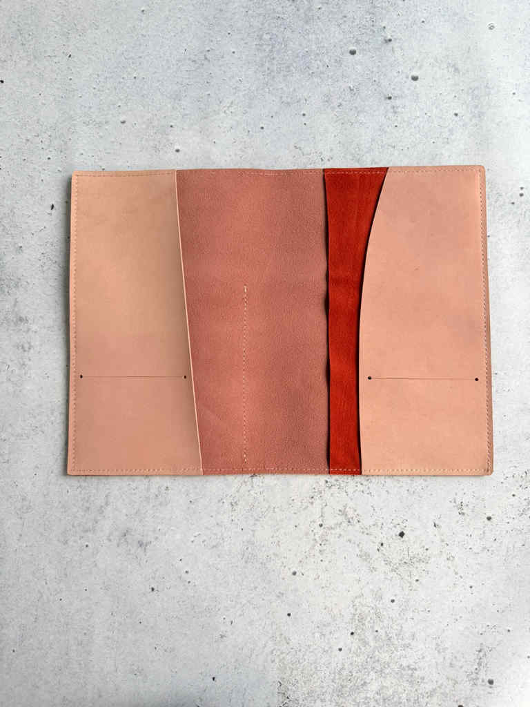 Rose nubuck is waterproof nubuck leather that has that amazing feeling to it. It’s in that perfect light pink shade with some natural marking to it. This cover is made with thin and floppy Tangerine suede pocket leather on the outside. Same leather is used for double inside pocket on the right side.