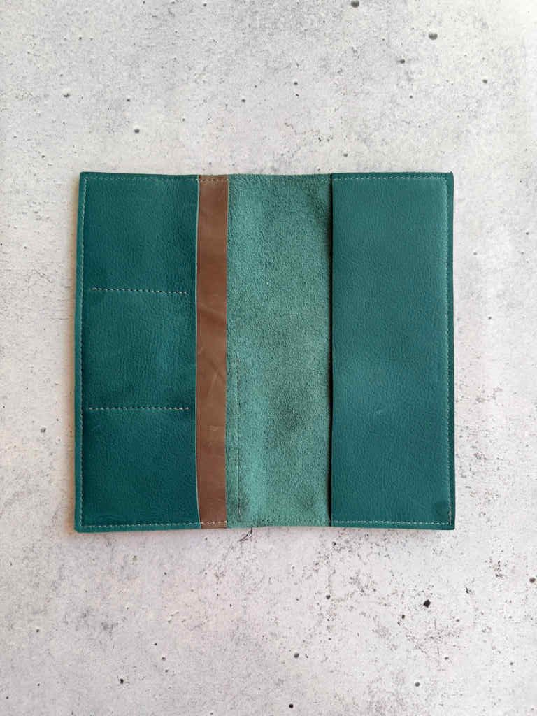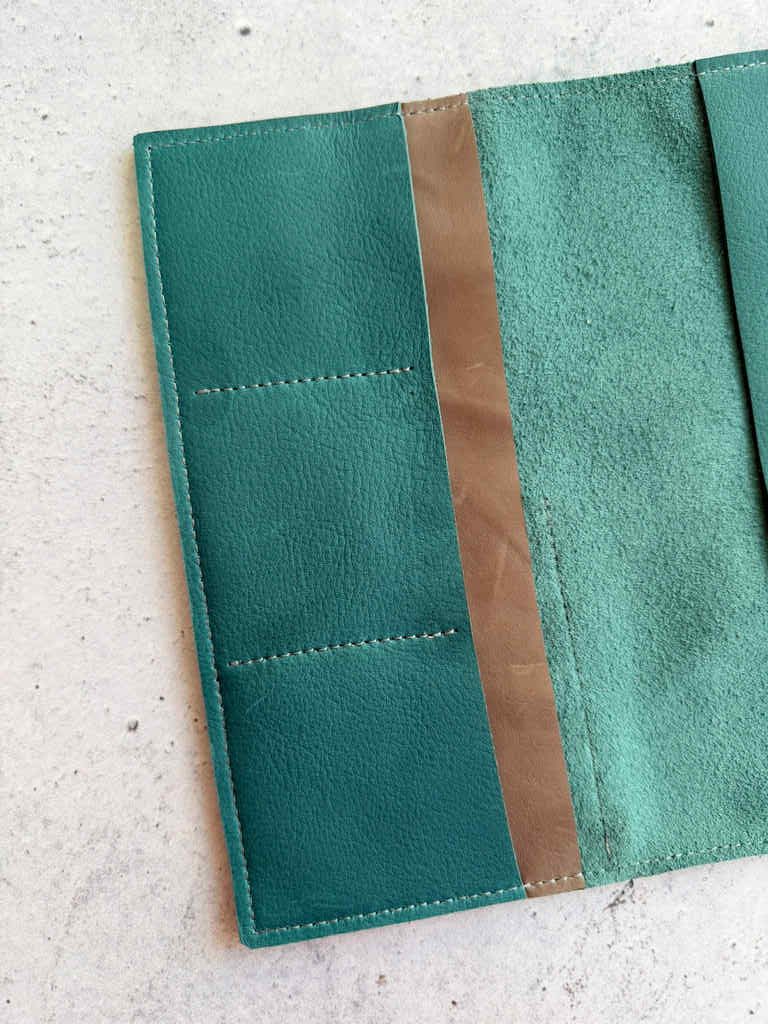 Sea glass blue nappa leather is smooth leather that’s amazing to touch. It has that green shade with blue undertone. Pairing with smooth buttery grey is one of my classics. Same pocket leather is used for the inside credit card pockets.
